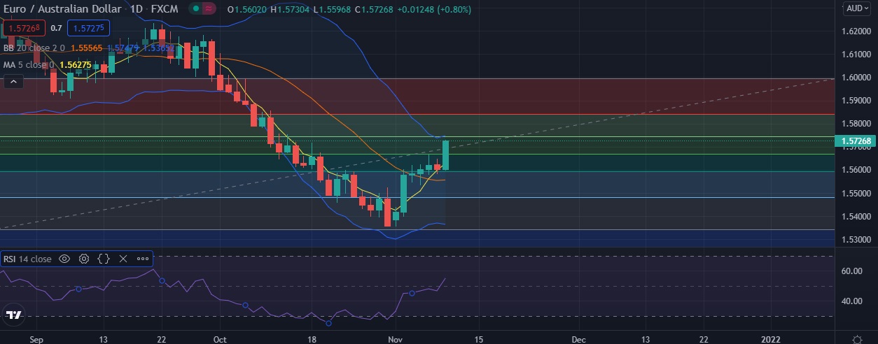 • EUR/AUD bulls confidence is running high, a test of the 1.5841 (23.6%fib)highly seems likely.