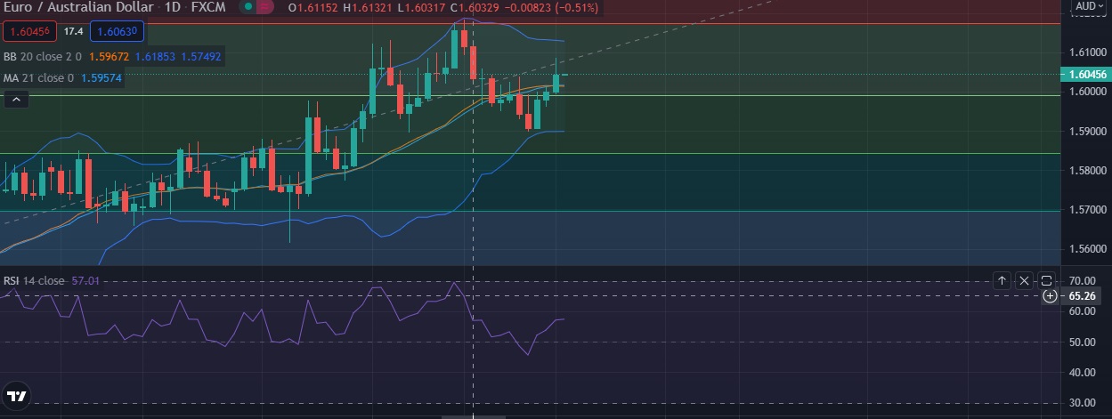 • EUR/AUD bulls confidence is running high, a test of the 1.6132 (Higher BB) highly seems likely.