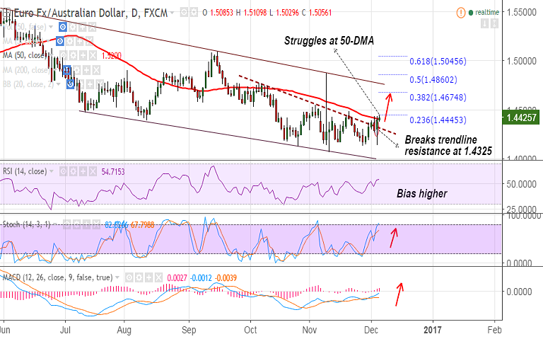 Recommendation: Go long on breakout above 50-DMA at 1.4407, SL: 1.43, TP: 1.4490, 1.4575