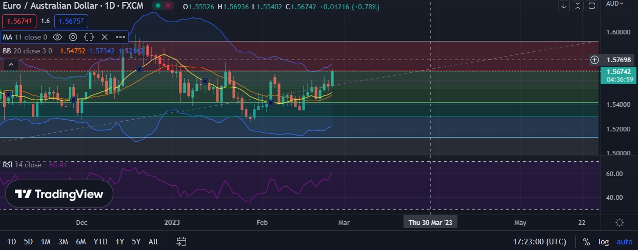 • EUR/AUD is now on course to register a close above 1.5685 (23.6%fib)level, chart points to bigger gains towards 1.5700.