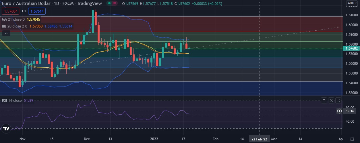 • Strong support is seen at 1.5747 (50% fib) and break below could take the pair towards 1.5702 (21DMA).