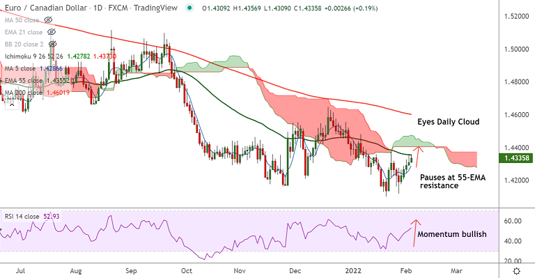 The pair is currently struggling at 55-EMA resistance, decisive break above will fuel further upside. Next major bull target lies at daily cloud base at 1.44.