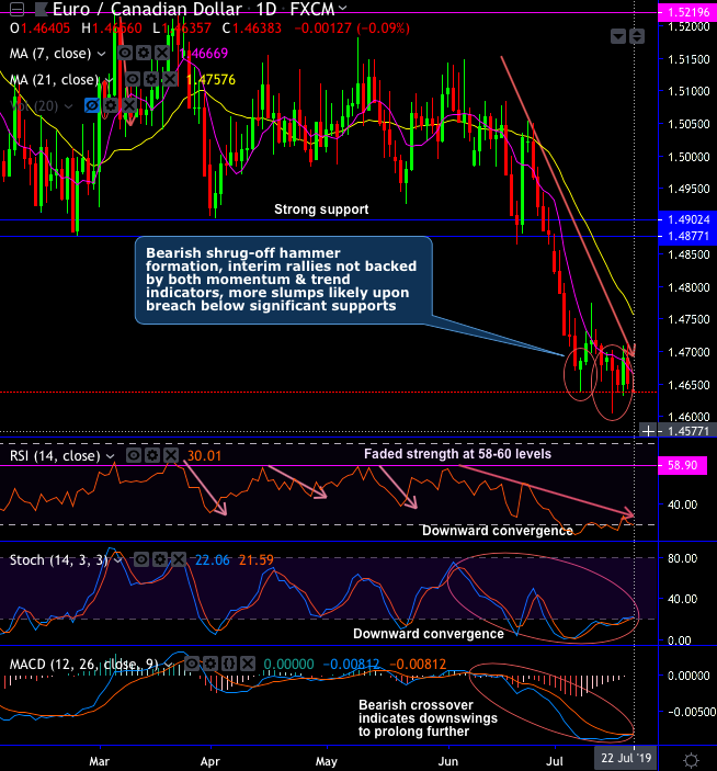 EURCAD hammer patterns have occurred at 1.4685 and 1.4670 levels respectively and bears shrug-off these bullish patterns.