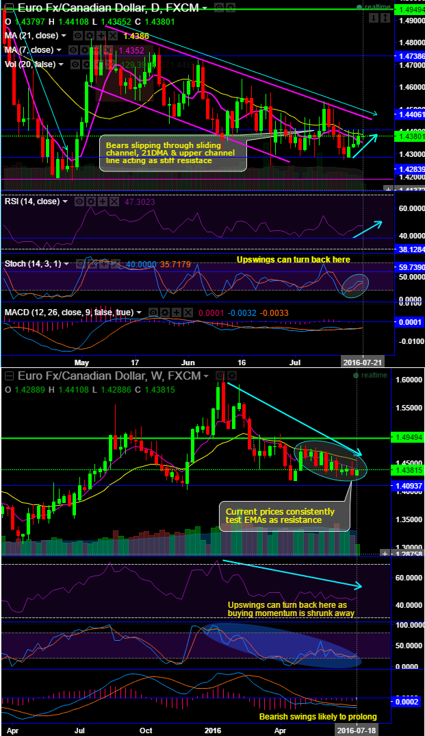 Technical Glimpse: Ever since the pair took supports at 1.4283, bulls consolidate the gains, but for now a stiff resistance is seen at 1.4406 levels from last four consecutive days.