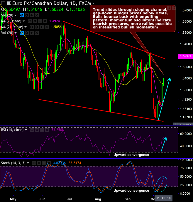 EURCAD minor trend slides through sloping channel (refer daily chart), where we traced out gap-down in the recent past that nudges prices below DMAs upto channel support.