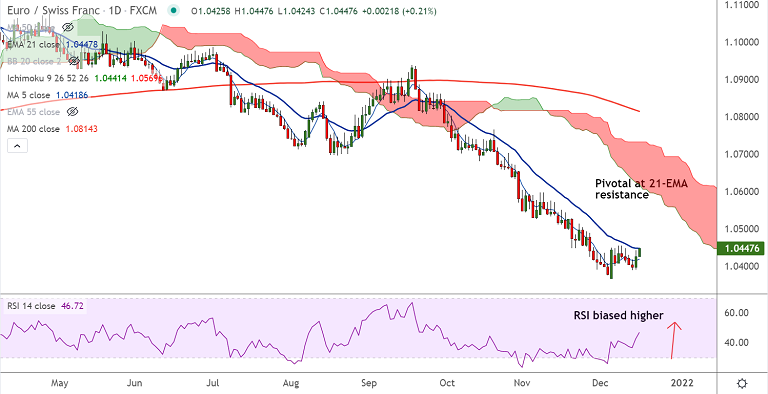 Summary: EUR/CHF is pivotal at 21-EMA resistance. Watchout for decisive break above for further upside.