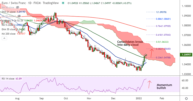 Summary: EUR/CHF trades with a bullish bias, scope for test of 1.0560.