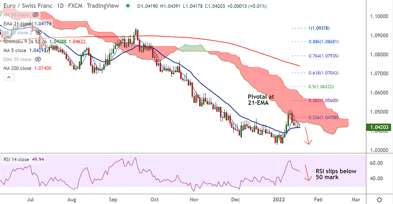 Summary: EUR/CHF pivotal at 21-EMA support. Watch out for break below for further weakness.