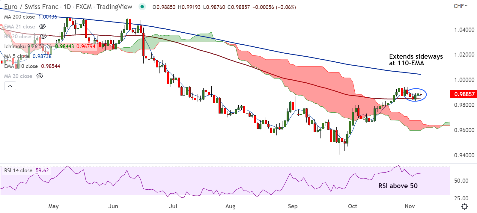 Summary: EUR/CHF trades with a neutral bias with a slight bullish bias. Resumption of upside will see test of 200-DMA at 1.00, weakness likely on breach below 21-EMA.