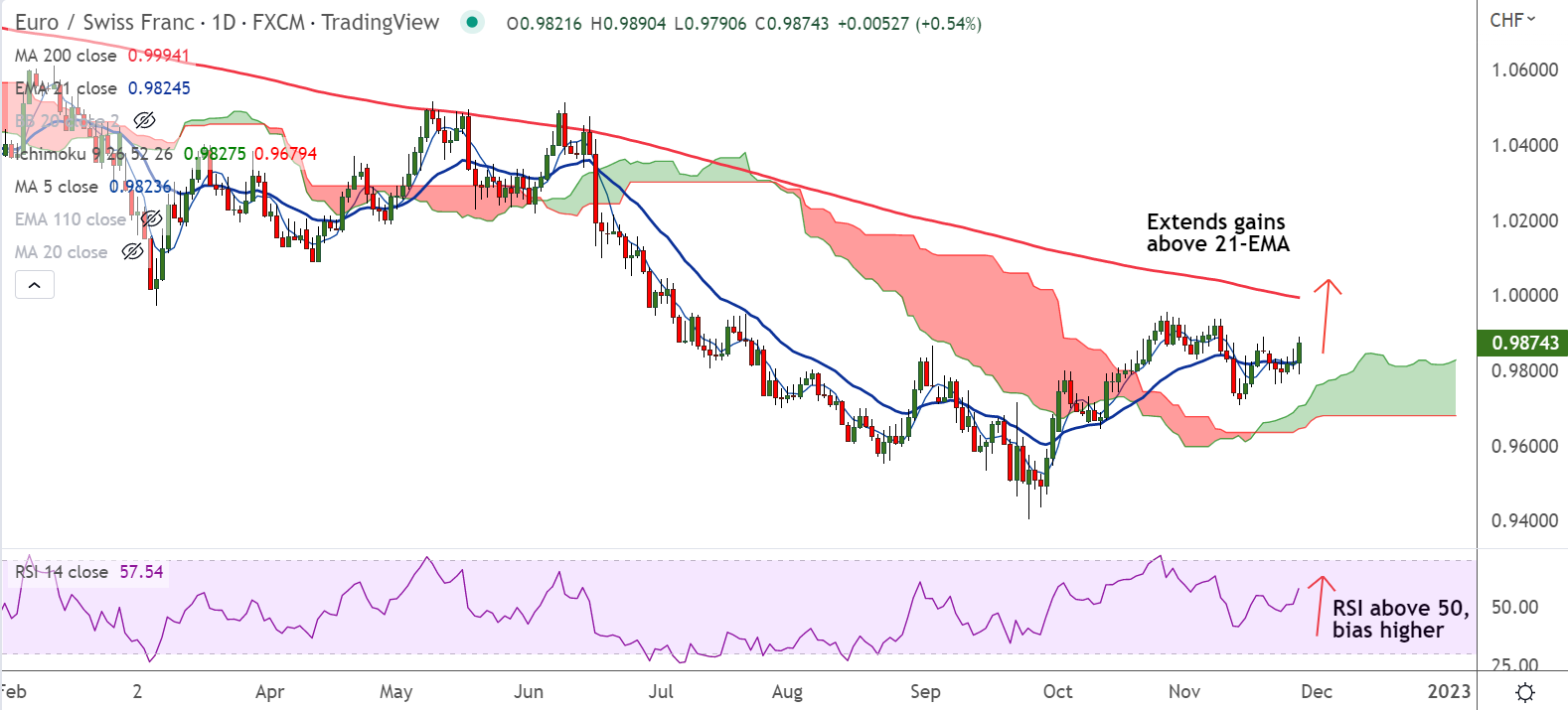 - EUR/CHF was trading 0.52% higher on the day at 0.9873 at around 13:30 GMT.