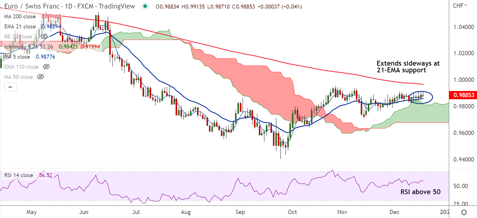Summary: EUR/CHF is likely to extend sideways at 21-EMA support. The pair finds strong support at daily cloud. Scope for upside remains as long as pair holds above 21-EMA and daily cloud.