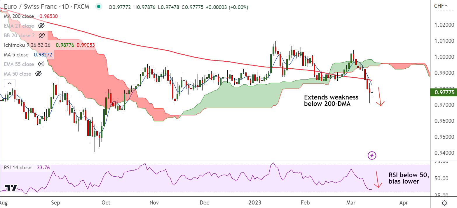 Summary: EUR/CHF poised to extend weakness. The pair is set to test fresh multi-month lows below 0.9713.