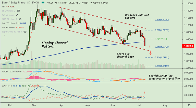 EUR/CHF technical bias turns strongly bearish on break below 200-DMA. Bears eye channel base support at 1.0830.