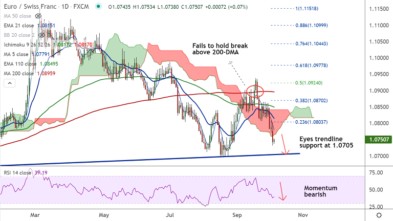 Summary: EUR/CHF trades with a bearish technical bias. Upticks on account of any upbeat data can be used to accumulate short positions. Next bear target lies at 1.0705 (Major trendline).