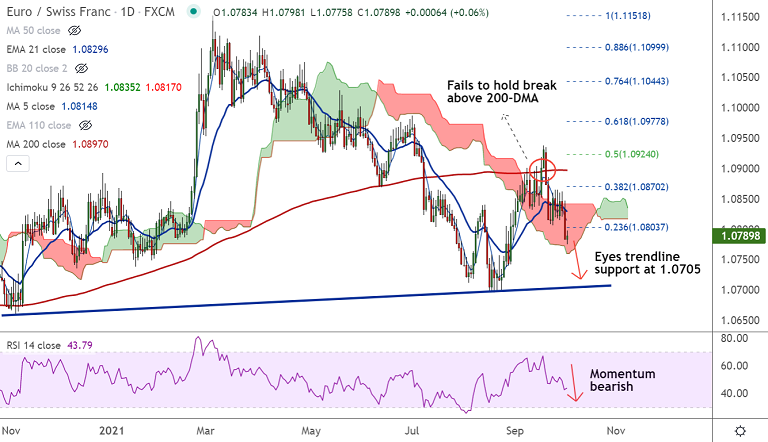 - The pair's recovery from multi-month lows at 1.0696 failed at 200-DMA resistance