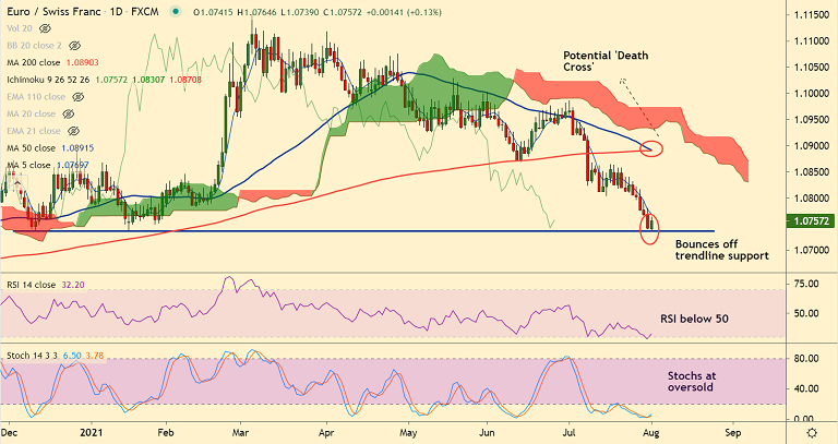 EUR/CHF was trading 0.15% higher on the day at 1.0759 at around 10:45 GMT, outlook remains bearish.