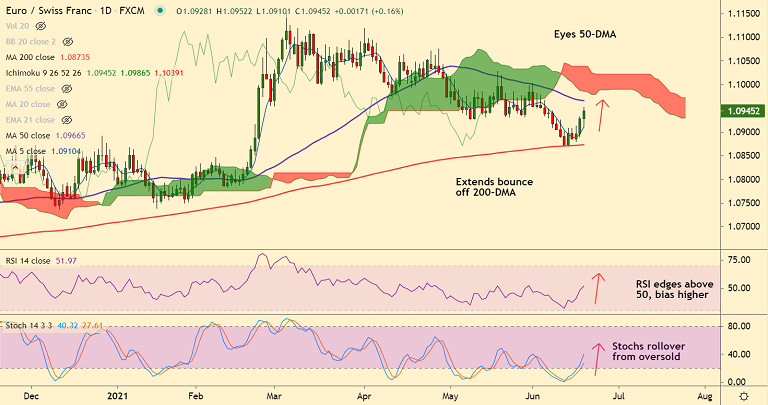 EUR/CHF is on track to test 50-DMA at 1.0966 ahead of daily cloud. Break above 1.10 (trendline) will propel the pair higher.
