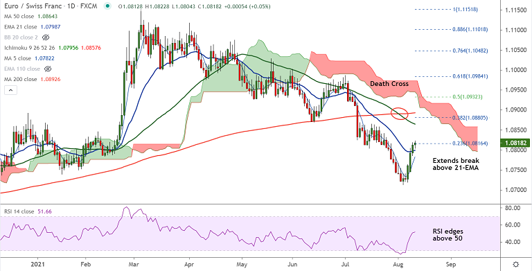 Summary: EUR/CHF is extending upside for the 4th straight session. Breakout above 21-EMA has raised scope for further upside. Bulls target 55-EMA at 1.0855.