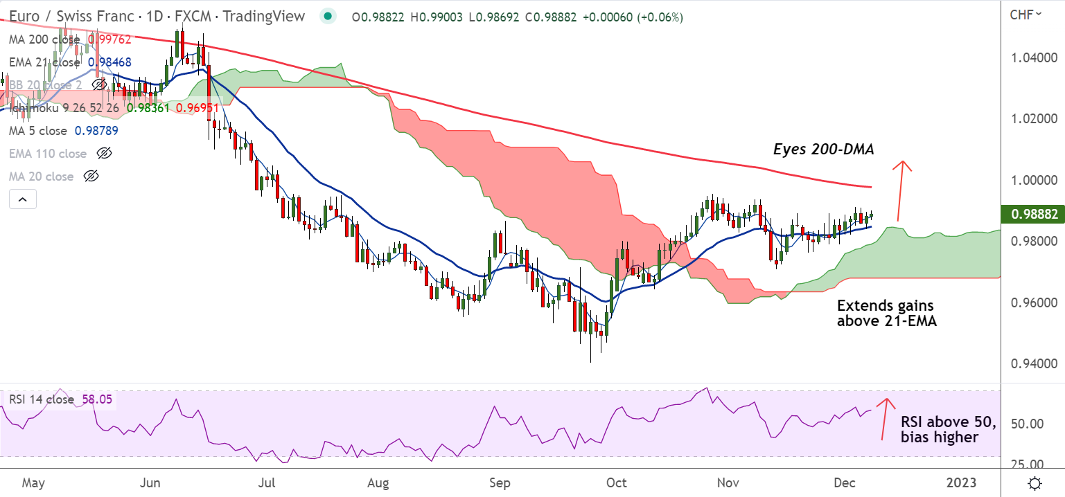 Summary: EUR/CHF trades with a slight bullish bias. Scope for test of 200-DMA at 0.9976. Weakness likely on retrace below 21-EMA.