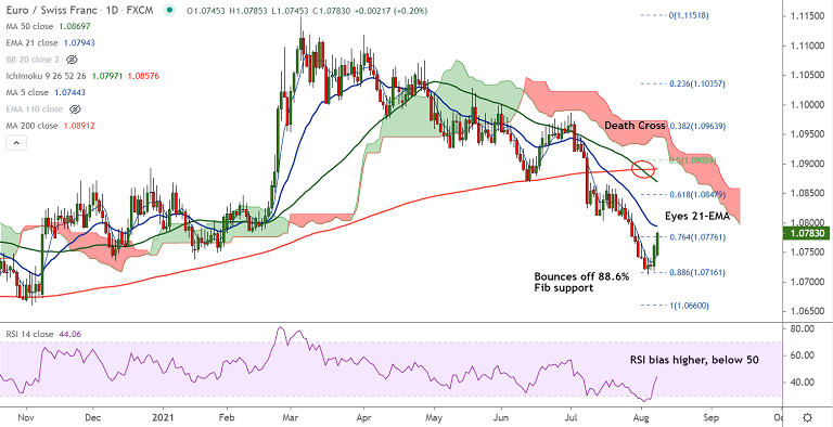 - EUR/CHF was trading 0.21% higher on the day at 1.0784 at around 13:00 GMT