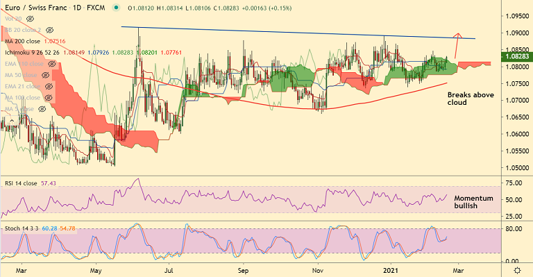 EUR/CHF was trading 0.16% higher on the day at 1.0829 at around 10:45 GMT, outlook is bullish.