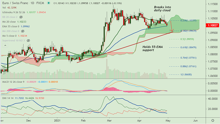 Summary: Technical bias for the pair is bearish. Price action has broken major trendline support and has dipped into daily cloud. The pair is currently testing 55-EMA support at 1.0996. Break below will see more weakness. Scope for dip till 38.2% Fib at 1.0963 ahead of trendline support at 1.0943.