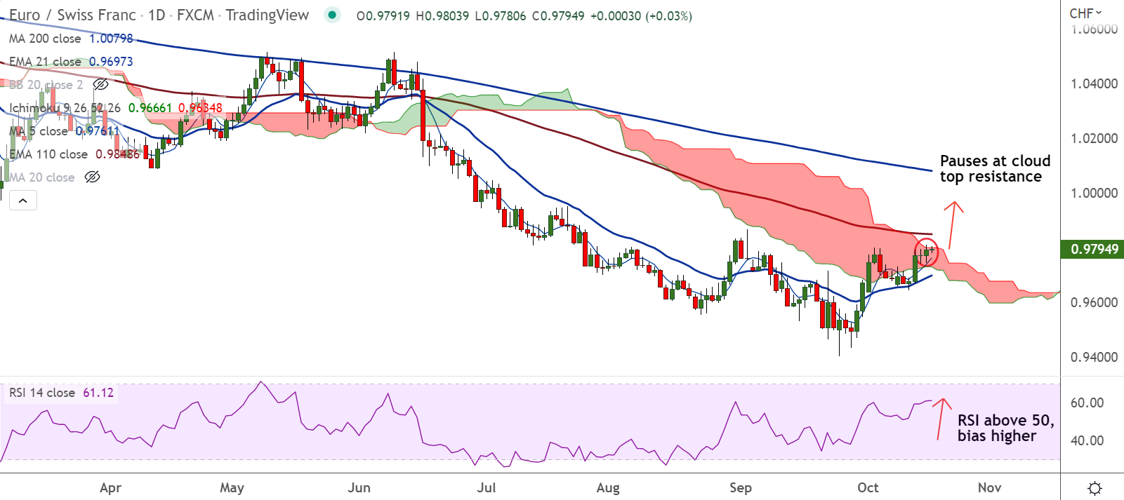 Summary: EUR/CHF pivotal at cloud top. Watch out for decisive break above for upside continuation.