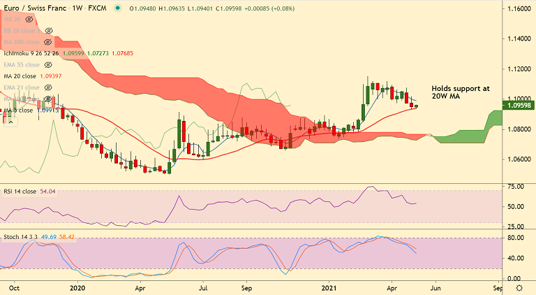 - The pair finds strong support at 110-EMA (1.0936) and 20W MA (1.0939)