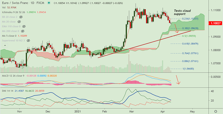 Next bear target lies at 55-EMA at 1.0977 ahead of 38.2% Fib at 1.0963. Bounce off cloud support and retrace above 5-DMA negates any bearish bias.
