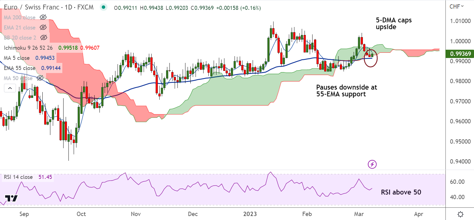 - EUR/CHF was trading 0.13% higher on the day at 0.9934 at around 11:20 GMT