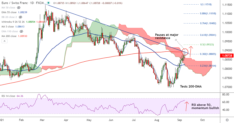 Summary: EUR/CHF bullish streaks meets major resistance at 1.0893. Momentum is still with the bulls. Decisive break above 200-DMA to see upside continuation. Next major bull target lies at 50% Fib at 1.0932.