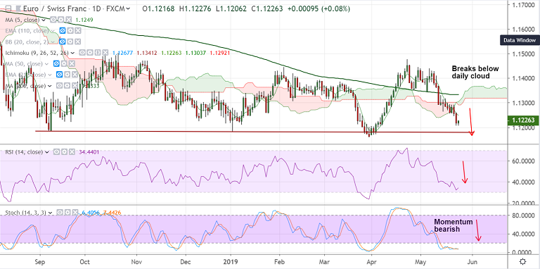 Momentum studies are bearish. Price action is set to extend weakness after break below daily cloud.