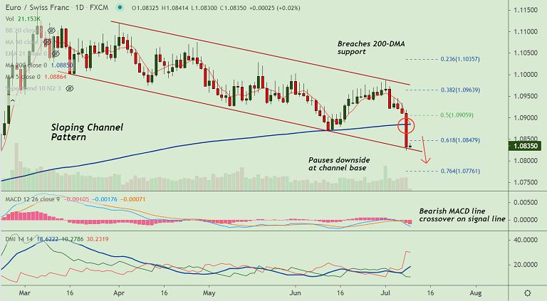 Breach below 200-DMA has opened downside in the pair. Break below channel base will drag prices lower.