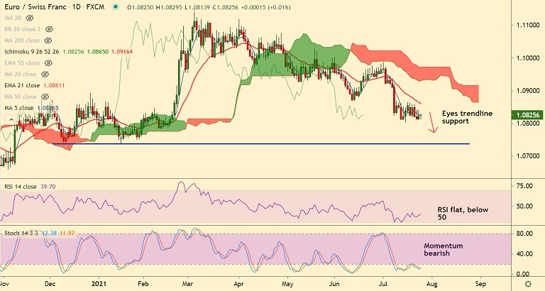Technical indicators are biased lower. The pair is poised for further downside. Scope for test of trendline support at 1.0735.