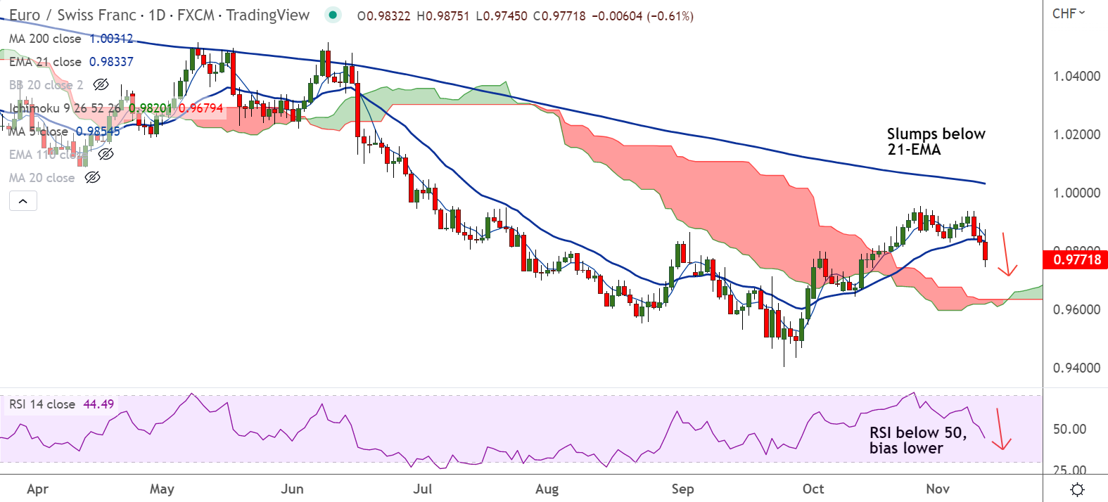 Summary: EUR/CHF trades with a bearish bias. Daily cloud at 0.9634 in sight.