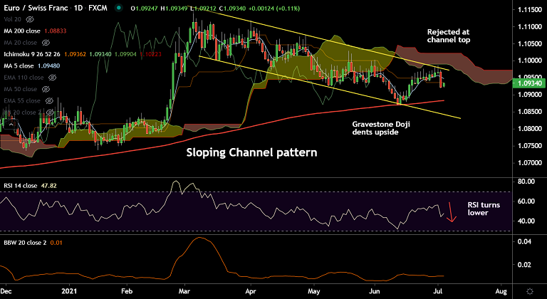 Summary: EUR/CHF trades with a bearish bias. Rejection at cloud top has raised scope for further downside. Scope for dip till 200-DMA at 1.0883. Bearish invalidation only above daily cloud.