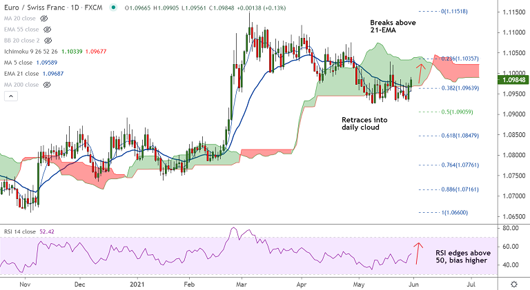 EUR/CHF is on track to test 50-DMA at 1.1003. Breakout above daily cloud will propel the pair higher.