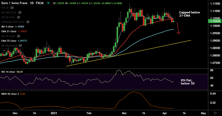 EUR/CHF snaps 4-day losing streak and was trading 0.06% higher on the day at 1.1032 at around 05:30 GMT.