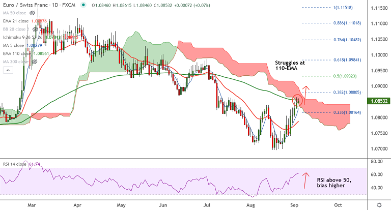 Summary: EUR/CHF has reentered into the daily cloud. 110-EMA is offering stiff resistance. Breakout above will fuel further gains.