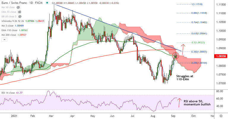 Summary: EUR/CHF struggles at 110-EMA resistance. Mixed economic data out from the euro area fails to provide any support. Focus on ECB policy meet due later this week for impetus.