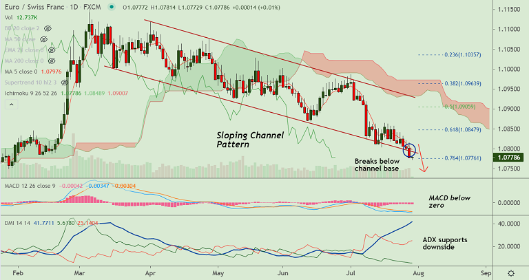 Price action has tested and is hovering around 76.4% Fib at 1.0776, technical studies indicate more downside.
