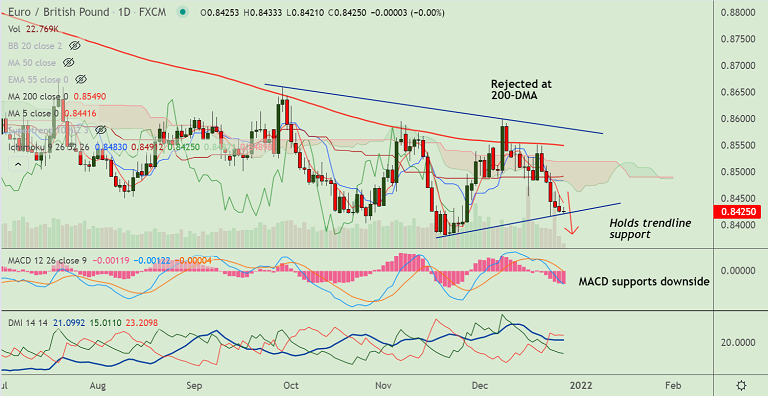 Summary: EUR/GBP poised for further downside. Dip till 0.82 levels in the near-term likely.