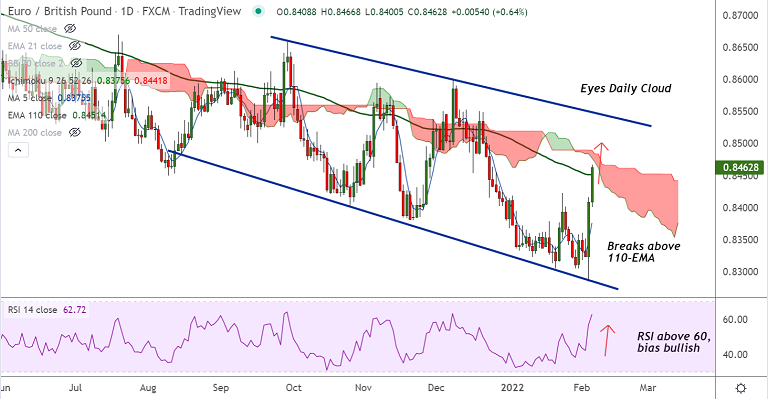 Summary: EUR/GBP poised for further gains. Scope for test of daily cloud at 0.8477. Break above cloud will fuel further upside.