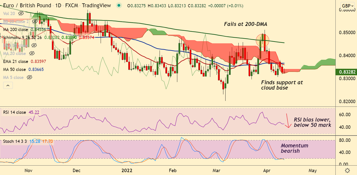 Summary: EUR/GBP trades with a bearish bias. The pair is holding support at daily cloud, breach below will plummet prices.