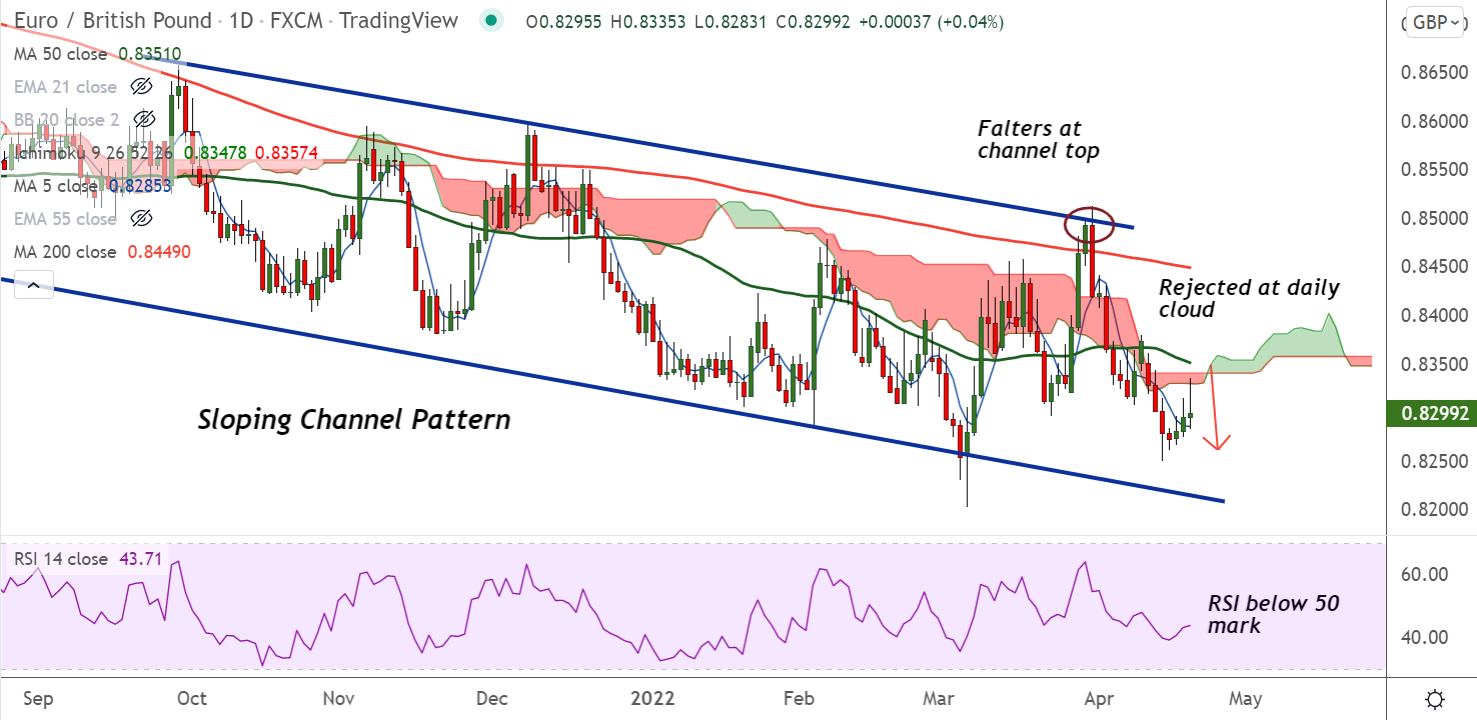 Technical bias remains bearish with upside being capped at daily cloud. Scope for test of channel base at 0.8215.