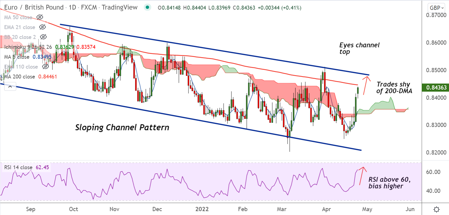 - Price action trades shy of 200-DMA and break above eyes channel top at 0.8490