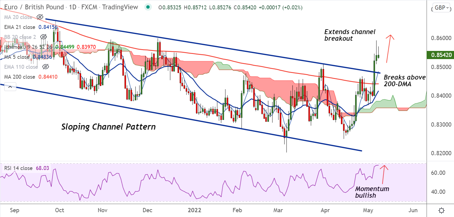 Summary: EUR/GBP is set to extend gains. Overbought conditions warrant some caution. Major trend is bullish, pullbacks are likely to be shallow. Watch out for break above 110-week EMA for bullish continuation.