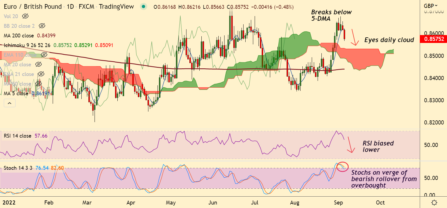 Technical indicators are turning bearish. The pair has slipped below 5-DMA and is on track to test daily cloud support at 0.8533.
