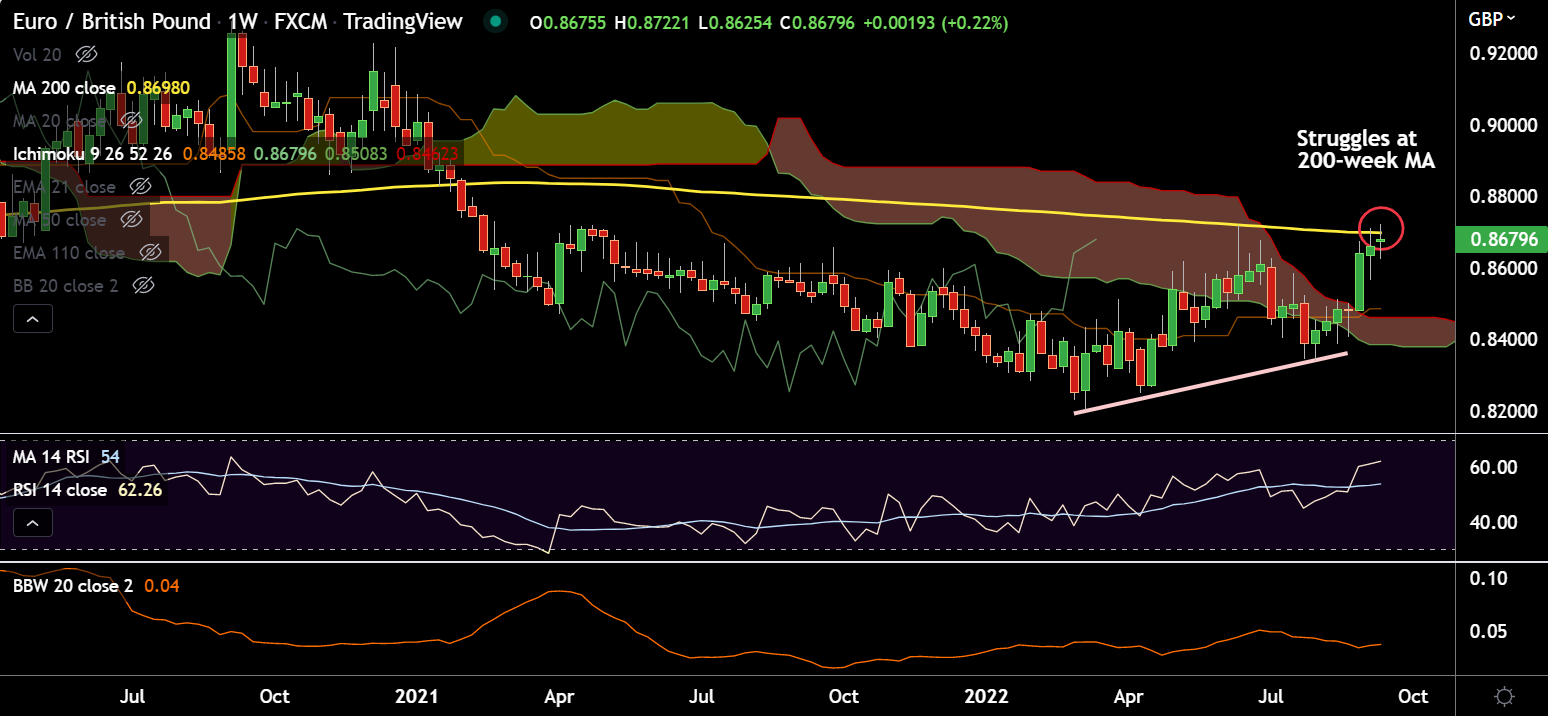- Price action has been capped at 200-week MA which is major resistance at 0.8698