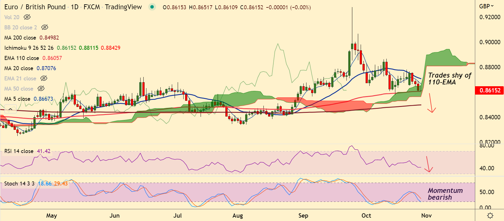 The pair is extending weakness for the fourth straight session and is currently trading shy of 110-EMA support at 0.8605.